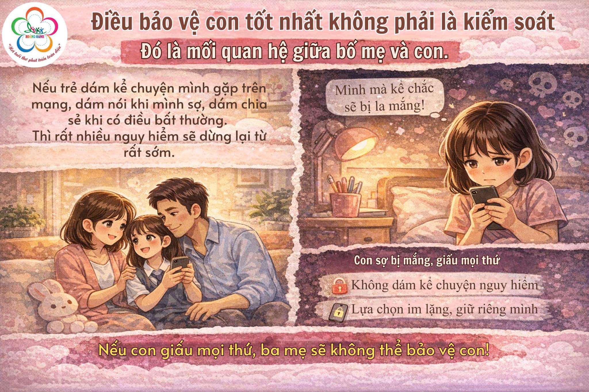Ngược lại, nếu trẻ sợ bị mắng, sợ bị cấm điện thoại, sợ Ba Mẹ không hiểu. Trẻ sẽ giữ mọi thứ cho riêng mình và khi đó, Ba Mẹ không còn cơ hội để bảo vệ con.