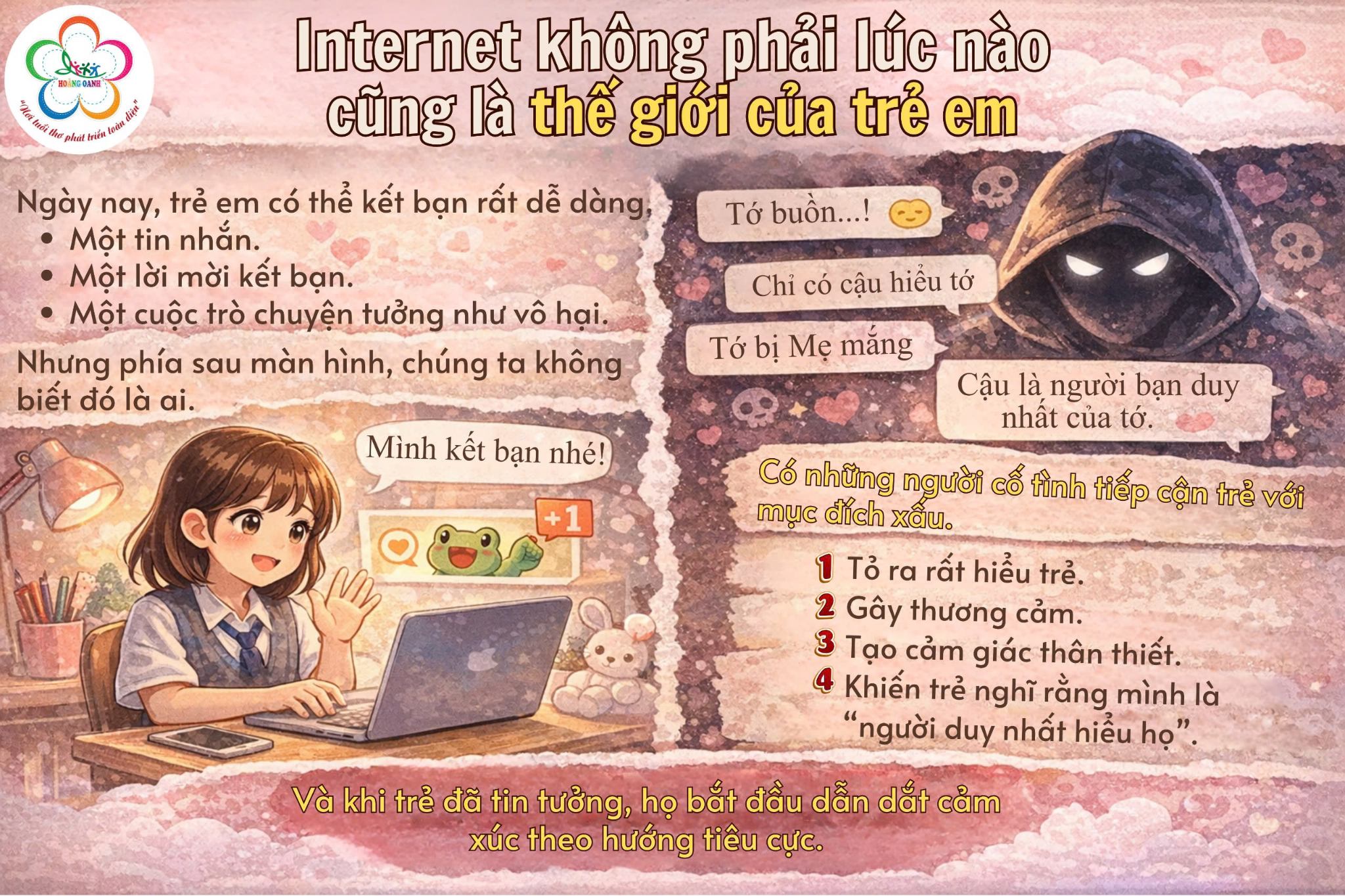 Trên internet có những nhóm người chuyên tìm đến trẻ em. Họ chọn những bạn đang buồn, đang bị mắng, đang cảm thấy cô đơn.