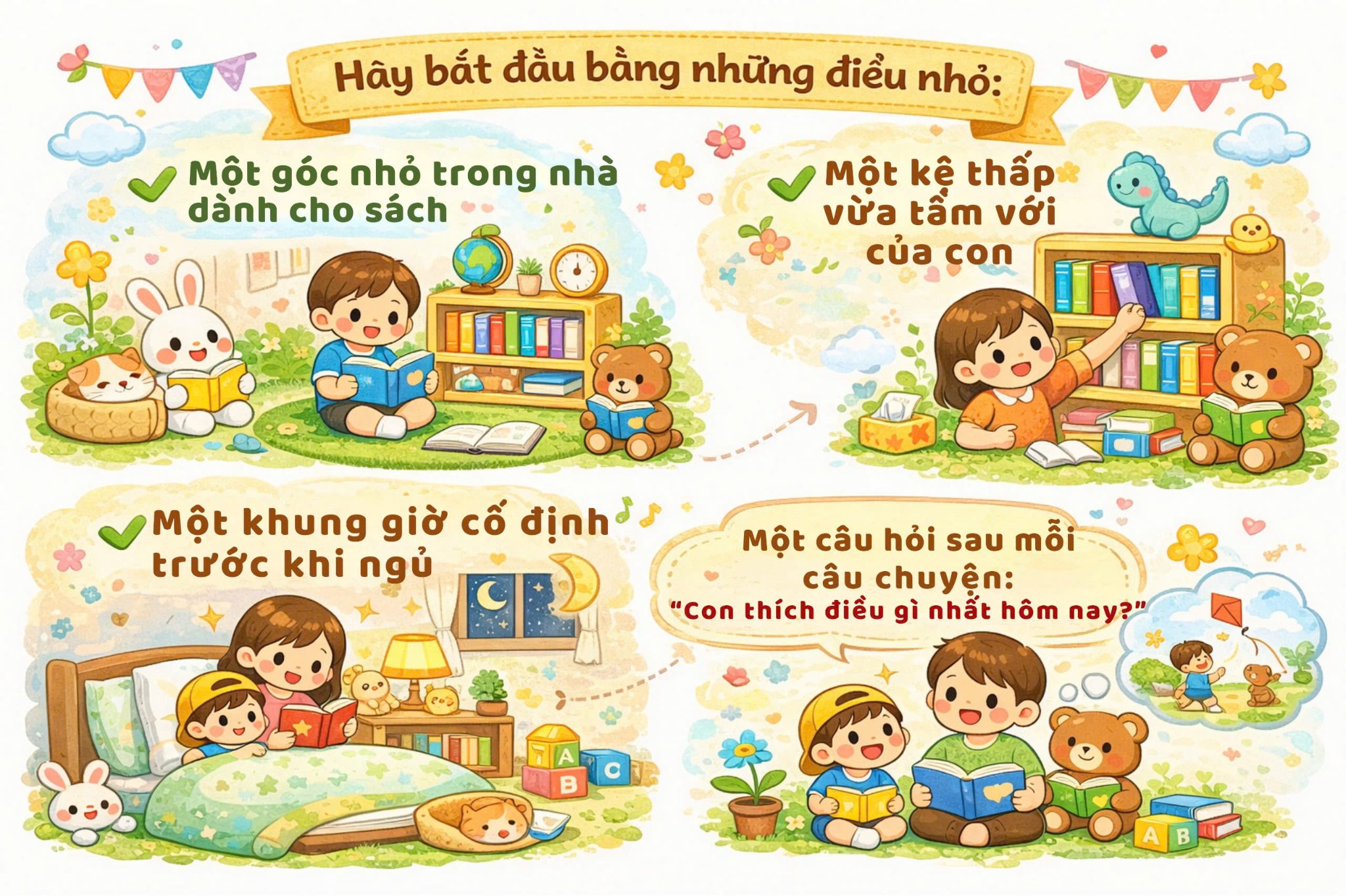 Trong thời đại mà màn hình có thể “giữ chân” con hàng giờ, việc ba mẹ ngồi xuống đọc cùng con 20–30 phút mỗi tối thực ra là đang gieo một hạt mầm rất dài hạn.