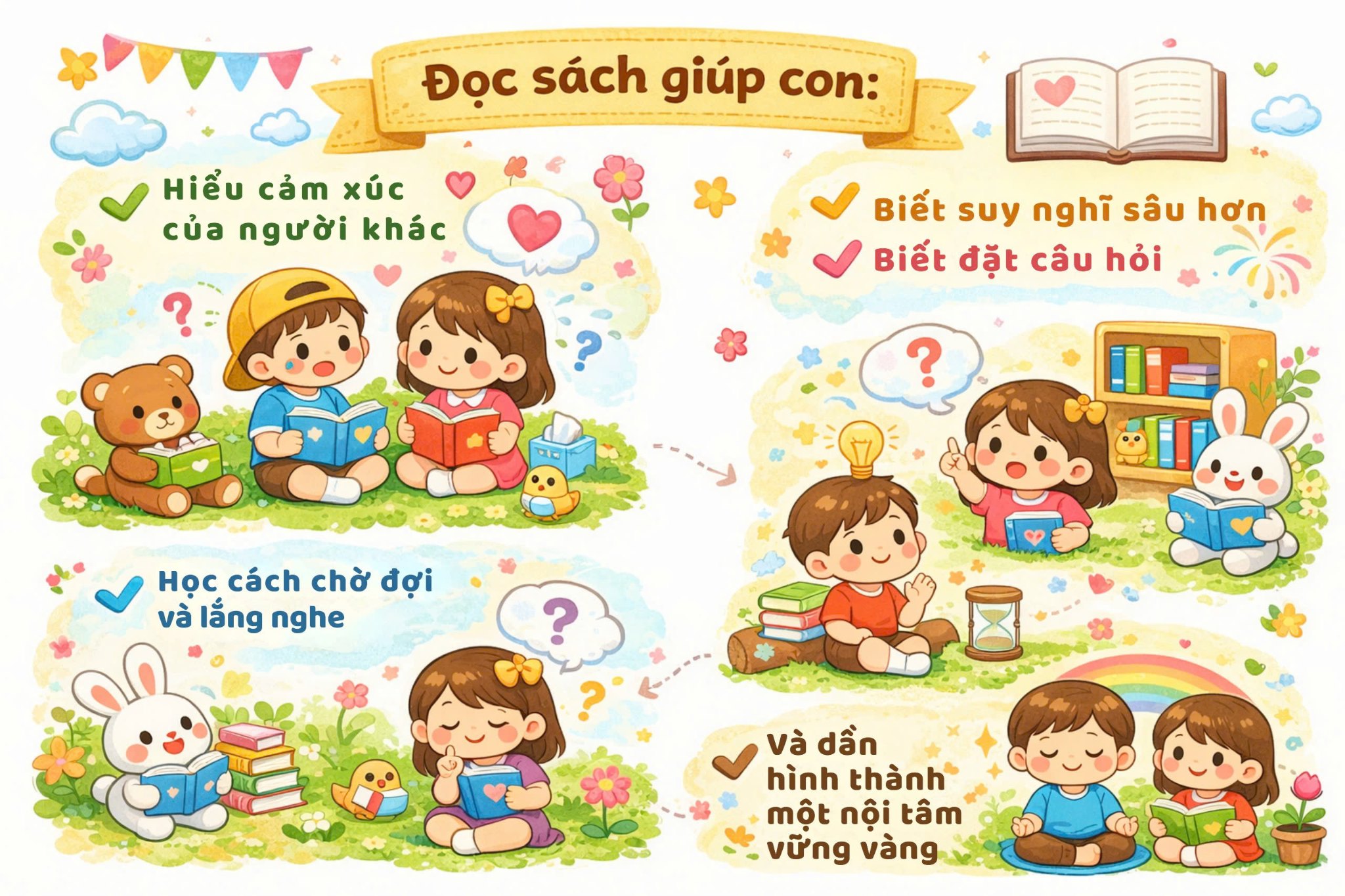 Một đứa trẻ đọc sách đều đặn không chỉ có vốn từ phong phú, mà còn có một thế giới bên trong đủ sâu để không bị cuốn trôi bởi sự ồn ào xung quanh.